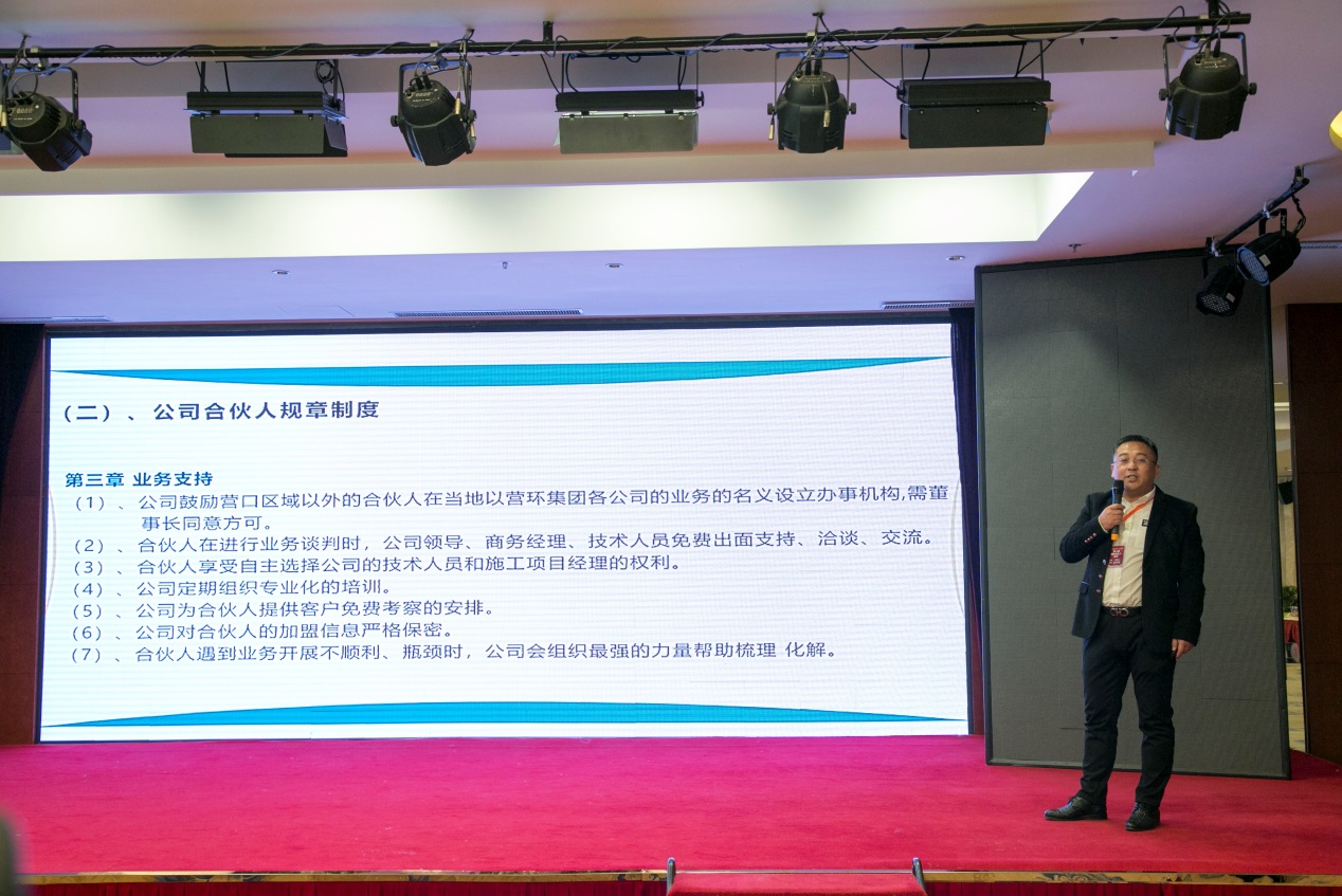 營口市環(huán)境工程開發(fā)有限公司賈喜東商務副總做《如何輕松達到事業(yè)另一個頂峰》報告,報告中就如何尋找項目、如何提高項目成功率及如何跟蹤已簽約項目、讓老客戶再次購買和轉(zhuǎn)介紹,進行分析講解。